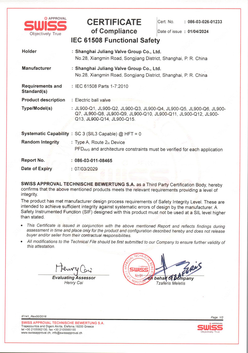 SIL 产品安全认证-电动球阀系列