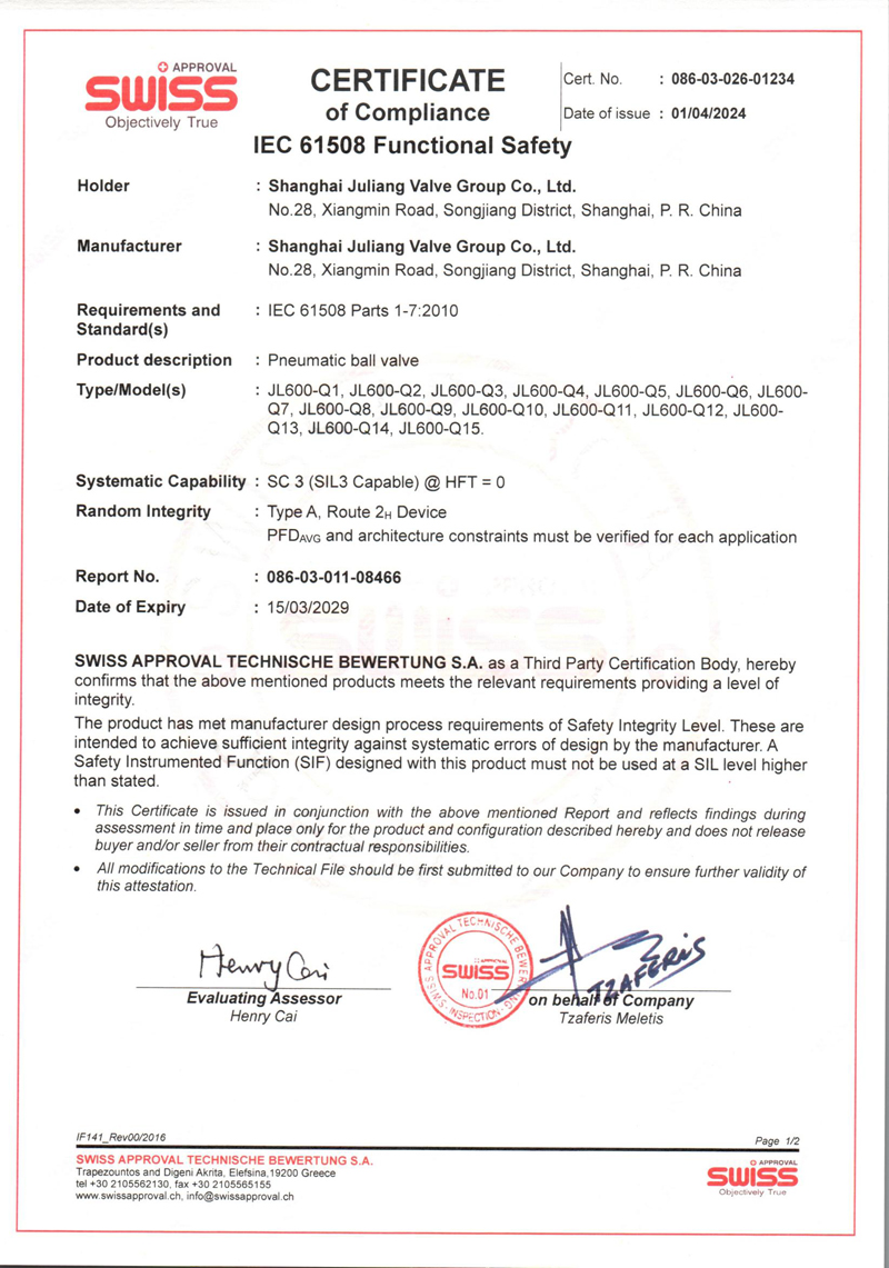 SIL 产品安全认证-气动球阀系列