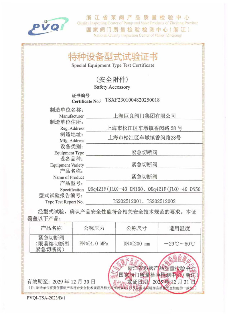 TS-紧急切断阀试验证书