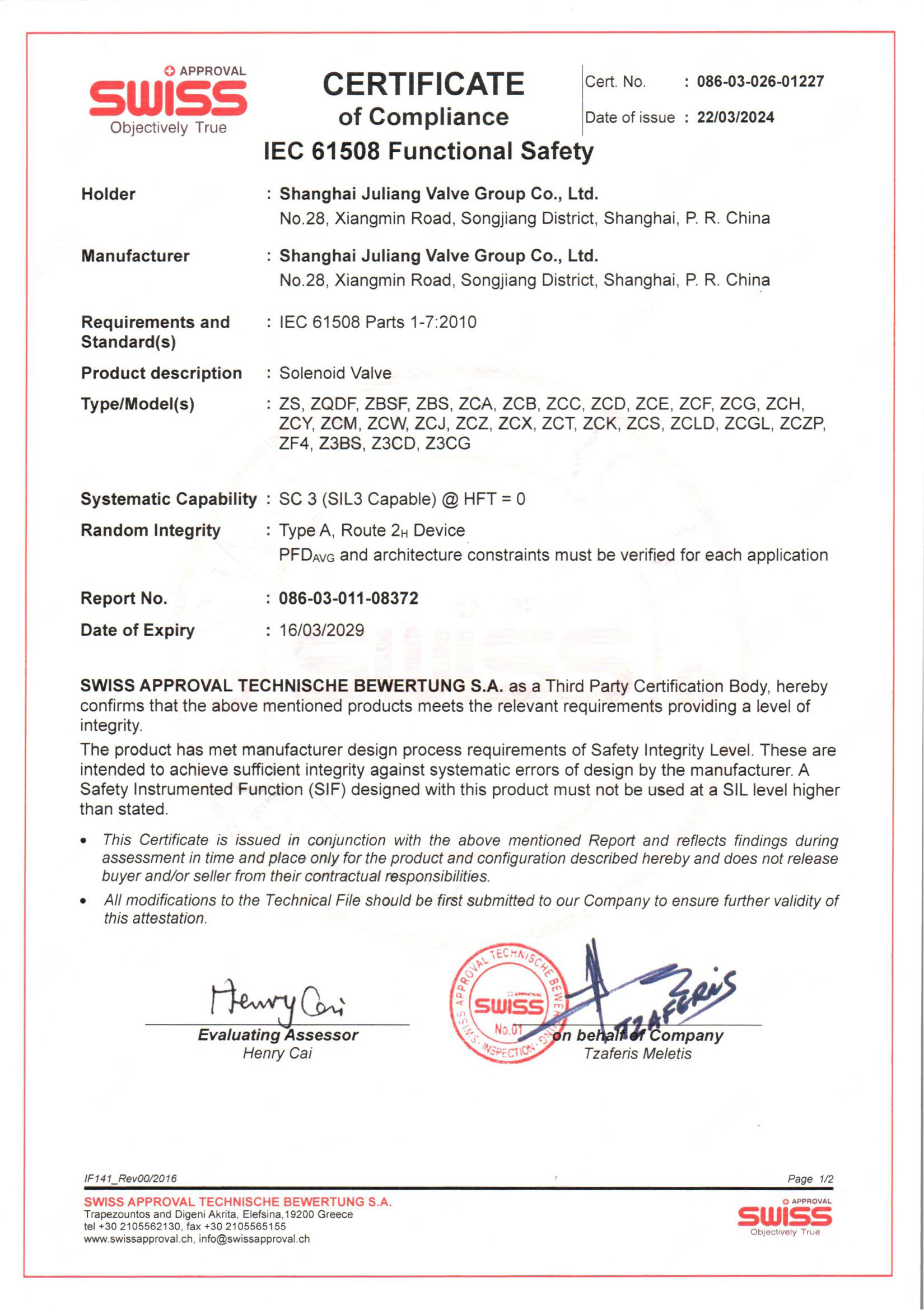 SIL 产品安全认证-电磁阀系列