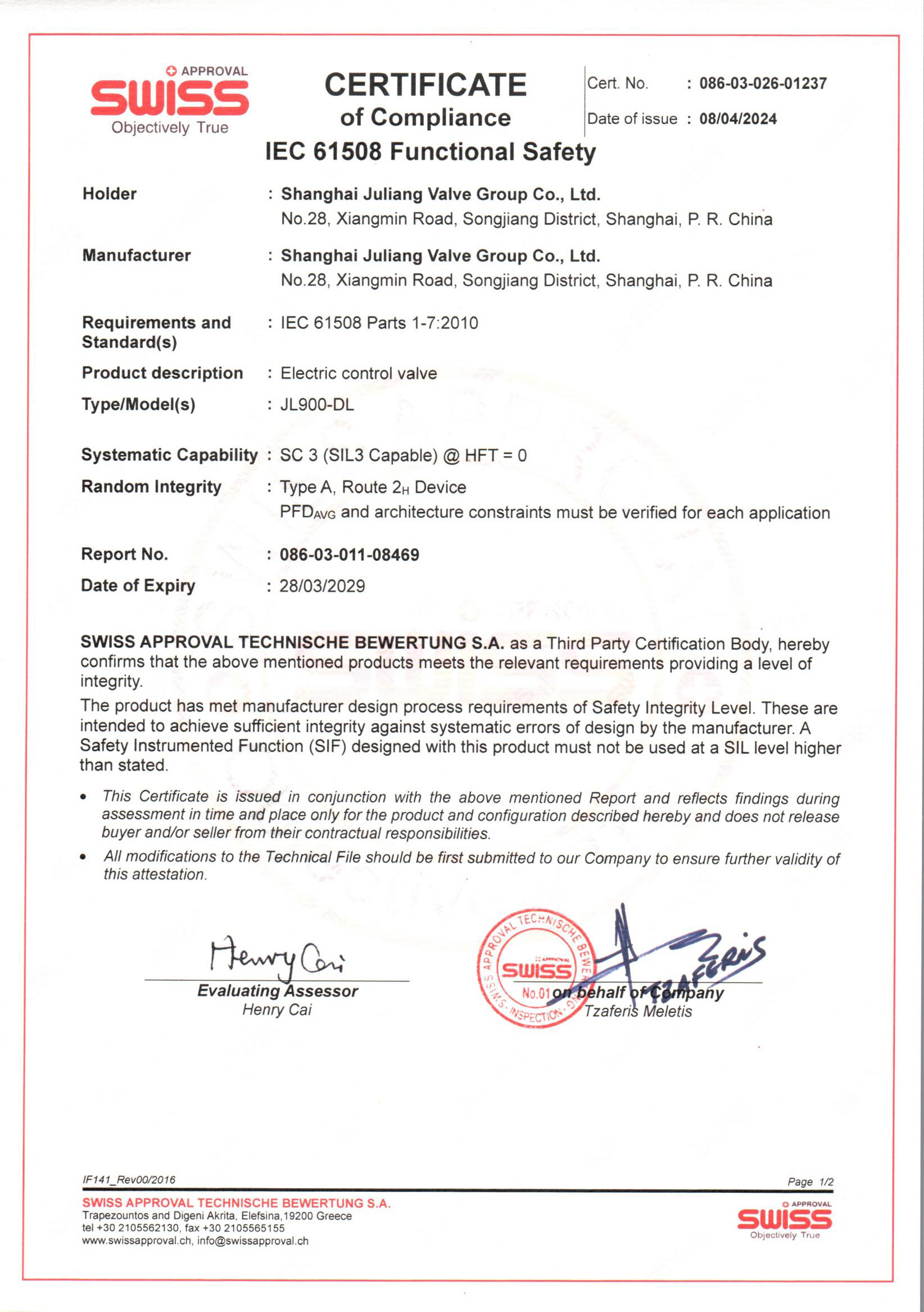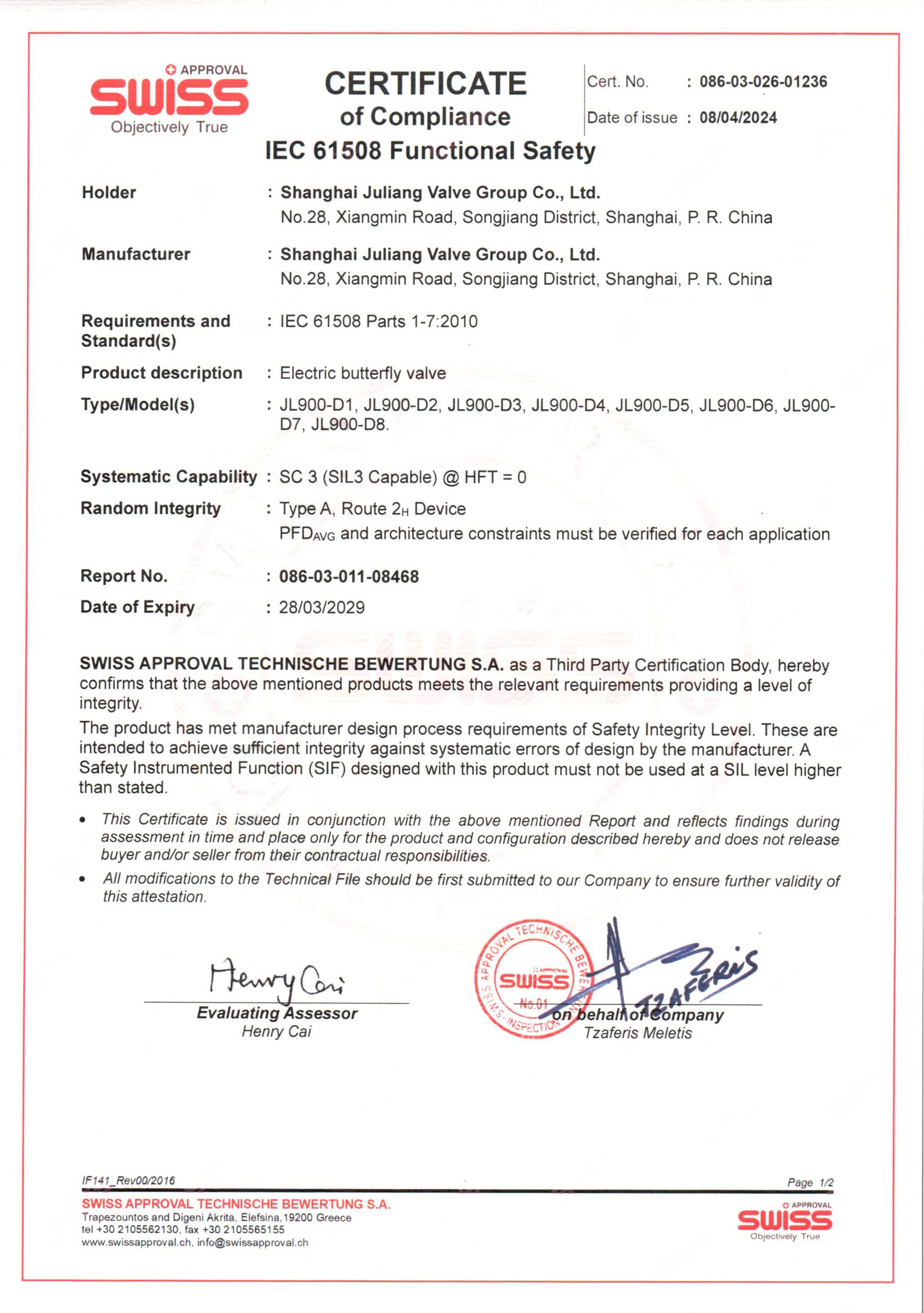 SIL 产品安全认证-电动调节阀系列