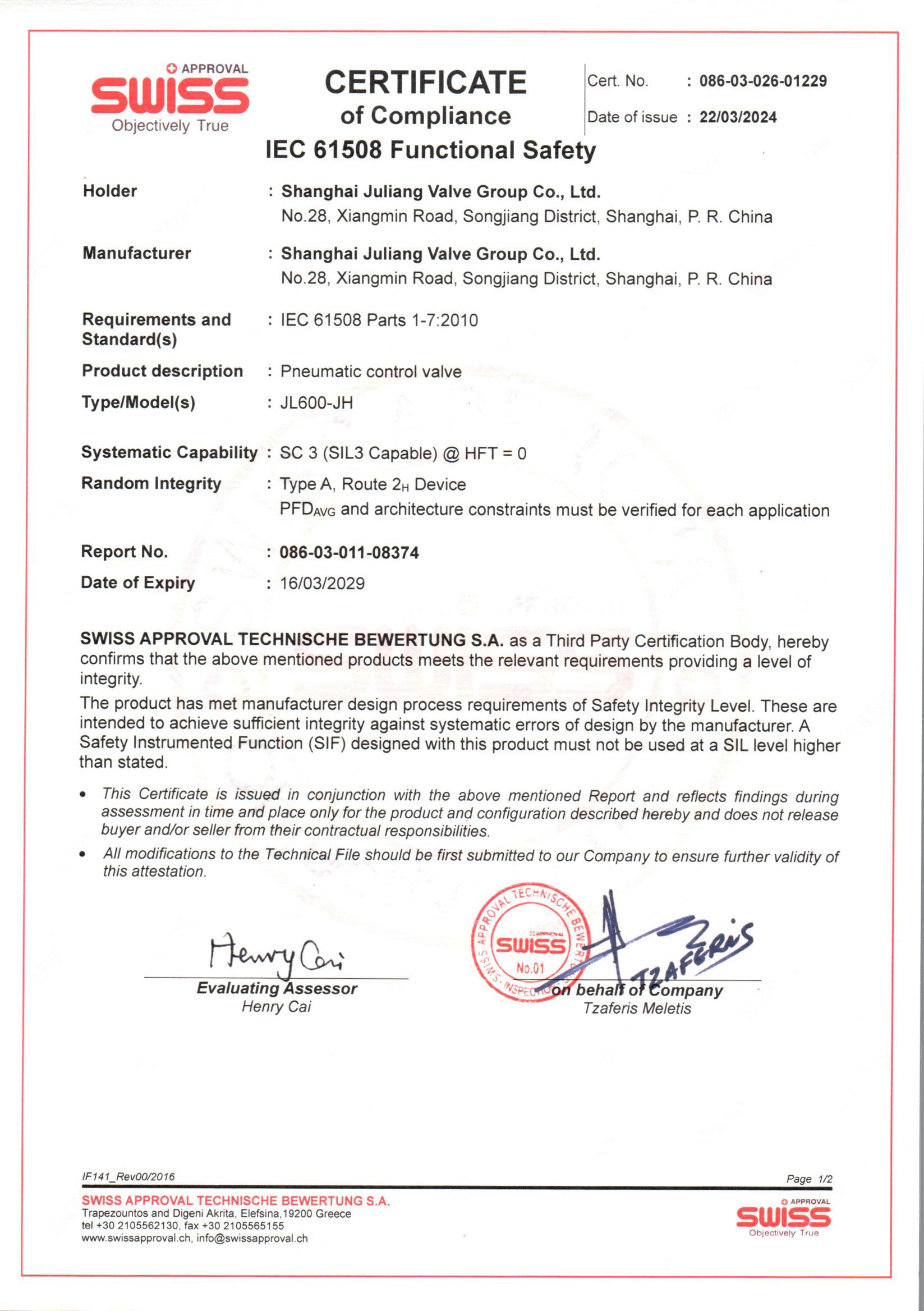 SIL 产品安全认证-气动调节阀系列