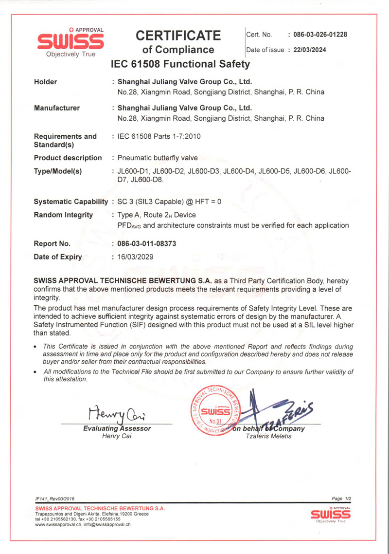 SIL 产品安全认证-气动蝶阀系列