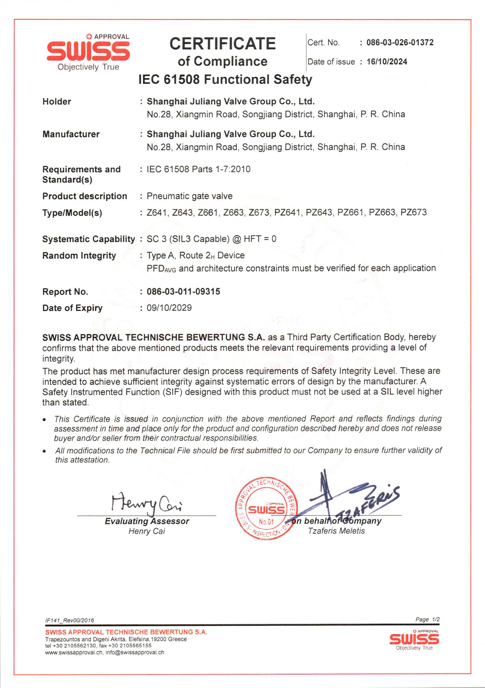 SIL 产品安全认证-气动闸阀系列